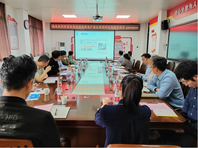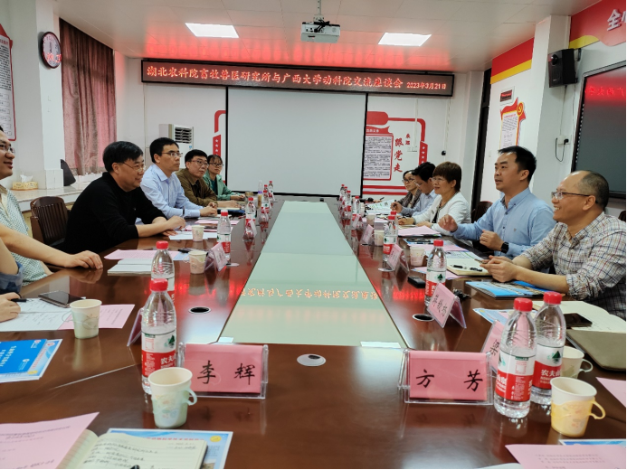 在何副院长介绍完广西大学及世界杯竞猜足球app概况之后,副所长毕延震和温国元简要介绍了湖北农科院畜牧兽医研究所的概况、现状及发展。湖北省农科院畜牧兽医研究所成立于1958年,一直致力于畜禽品种选育、畜禽疫病诊断与防控等方面的研究,有瘦肉猪育种、动物营养、兽医等专业研究室6个,建立国家家畜工程技术研究中心、湖北省动物疫苗工程技术研究中心等国家级和省级科研平台8个以及综合试验示范基地1个,形成了养猪、家禽、兽医等优势和特色学科。两位副所长还着重介绍了研究所的人才队伍建设,国家级和省部级科研项目以及经费情况,在科技奖项、畜禽品种培育及论文发表方面的成果,国家级和省级科研平台及院企共建情况,科技创新和成果转化情况、人才结构特点和在人才引培上遇到的问题,强烈希望我院今后输送高水平博士毕业生到研究所就业,并希望与我院开展研究生联合培养。随后,温国元副所长还介绍了兽医研究室的概况和自己在高效新型畜禽耐热活疫苗研究开发上取得的重要成果,吴俊静研究员和陈芳副研究员分别简要介绍了猪育种研究室和动物营养研究室的基础和应用研究状况以及取得的成果。