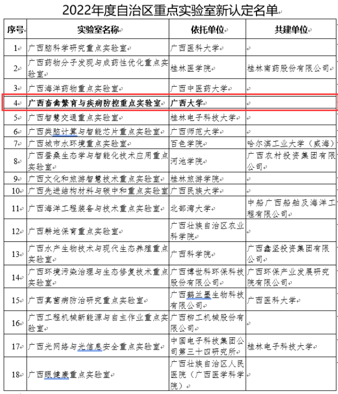 9月30日,广西壮族自治区科学技术厅公布了2022年度自治区重点实验室新认定名单,全区共有18个重点实验室通过认定,其中包括了我院申报的“广西畜禽繁育与疾病防控重点实验室”。