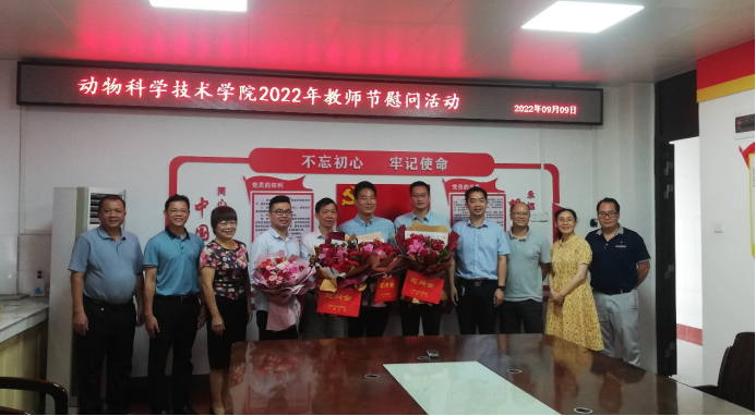 2022年9月9日上午,我院在学院302会议室举行2022年教师节慰问活动,学院党委书记顾慕娴、常务副院长陆阳清慰问了我院教职工代表胡传活、蒋钦杨、李辉和苏接瑜,向他们送上鲜花和慰问金,并通过他们向全院教师致以节日祝贺问候和美好祝愿。副院长宁鹏飞、何家康和韦祖樟及学院各部门代表参加了本次慰问活动。(图/罗敏芳 文/李爱友)