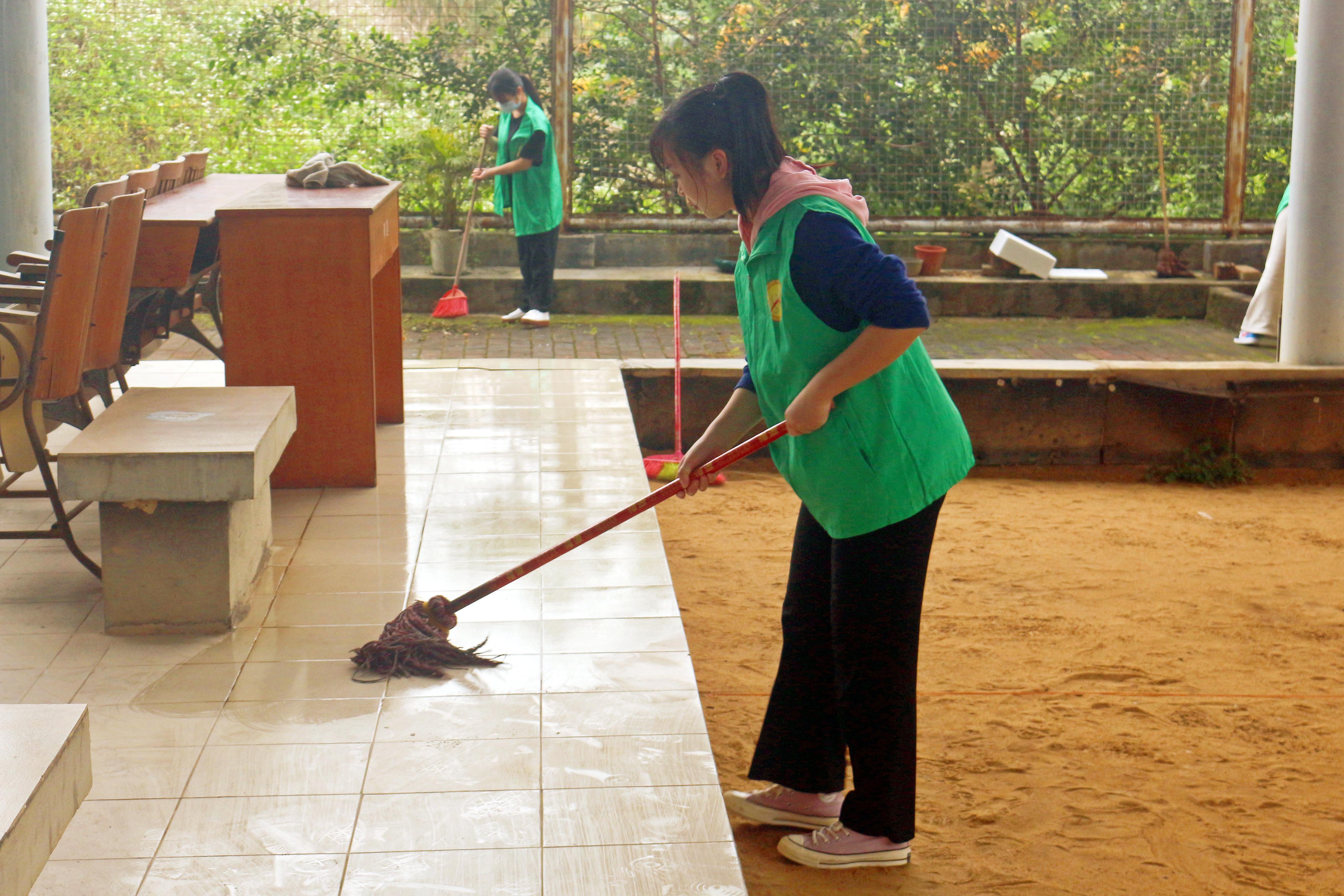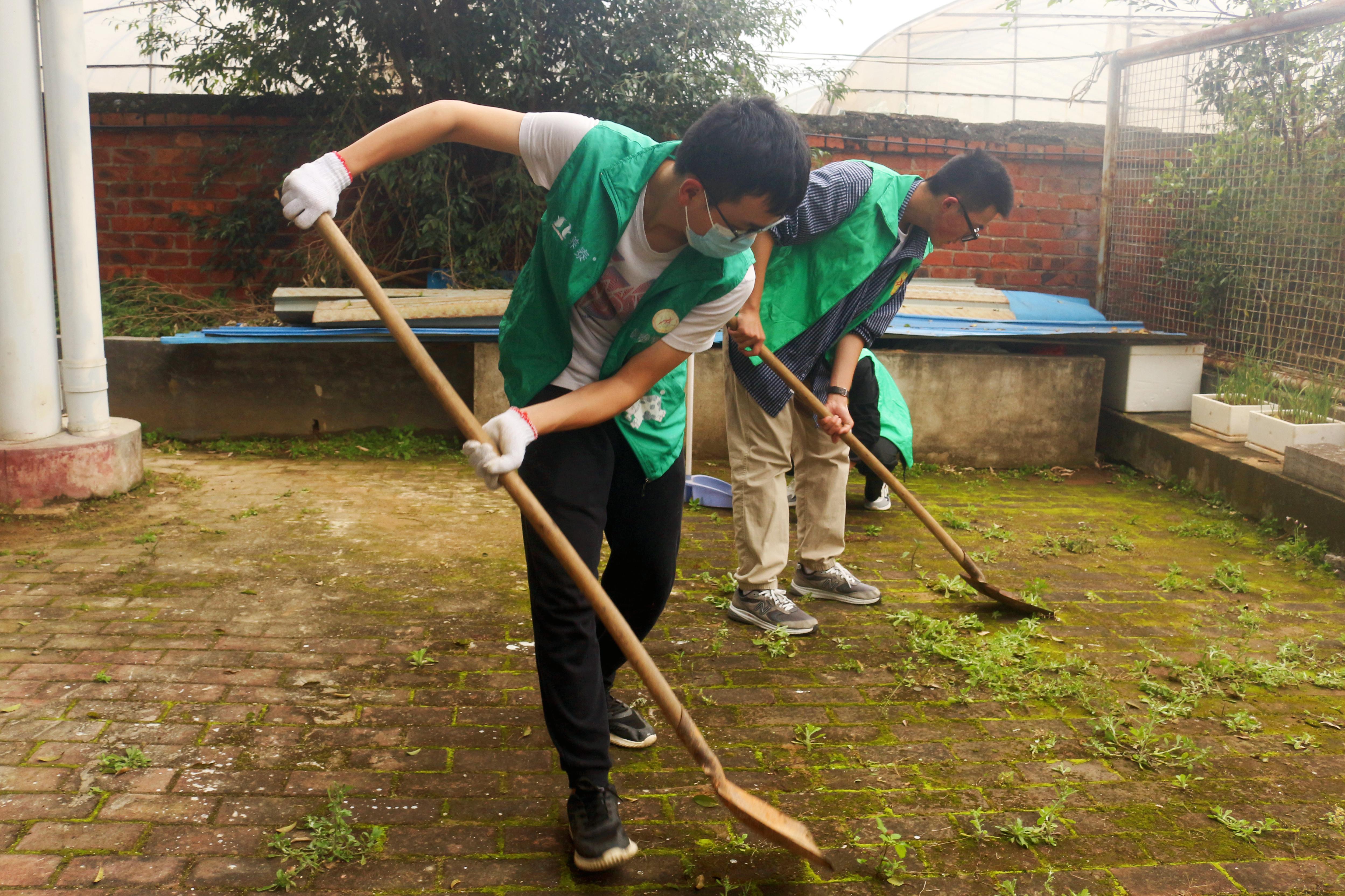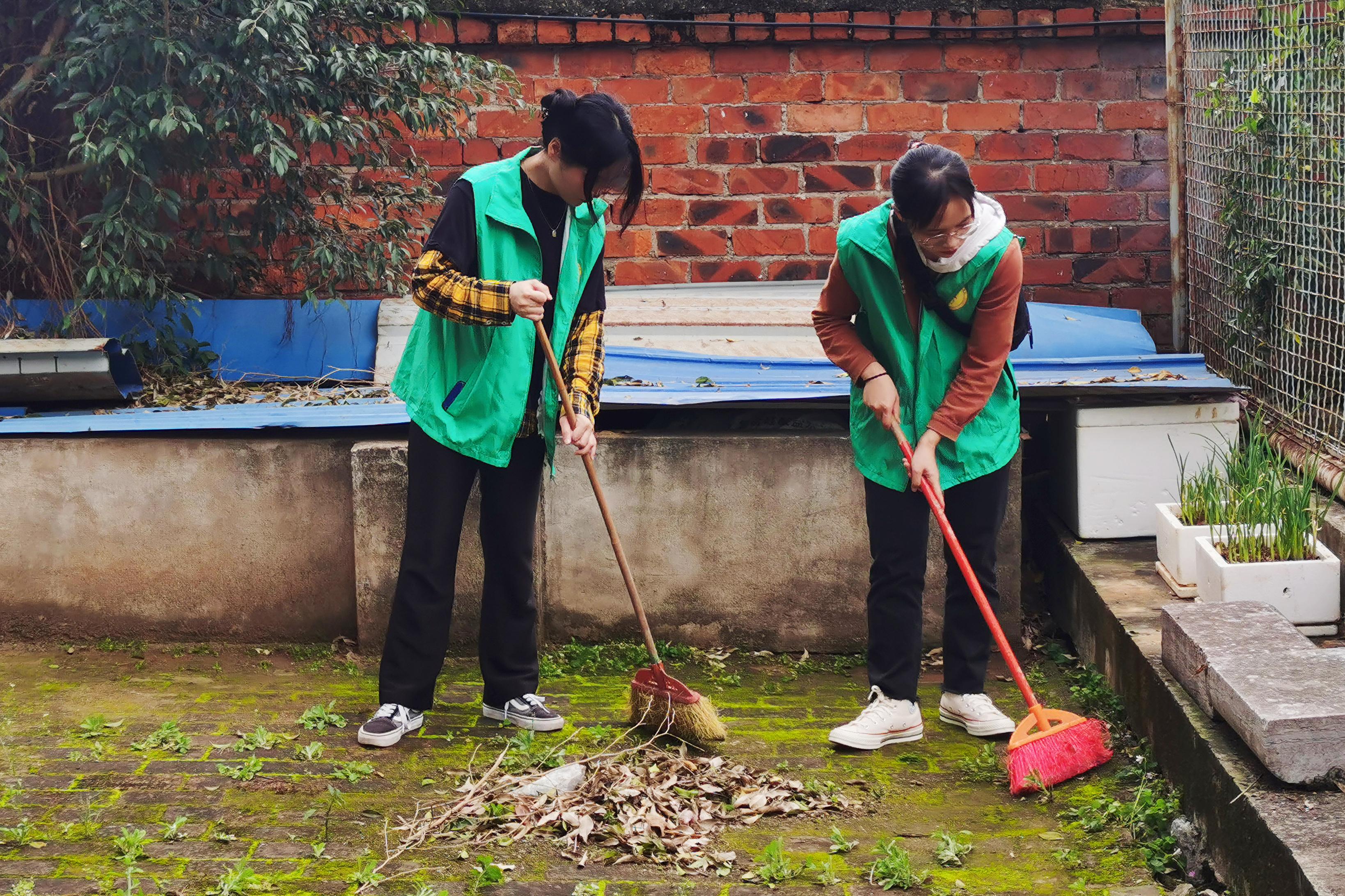 志愿者们身穿绿马甲,拿着抹布、扫帚、拖把、锄头、铲子等工具,分工协作,相互配合,对活动中心内的垃圾、杂草、树枝等进行清理。经过两个小时的辛勤劳动,活动中心焕然一新。