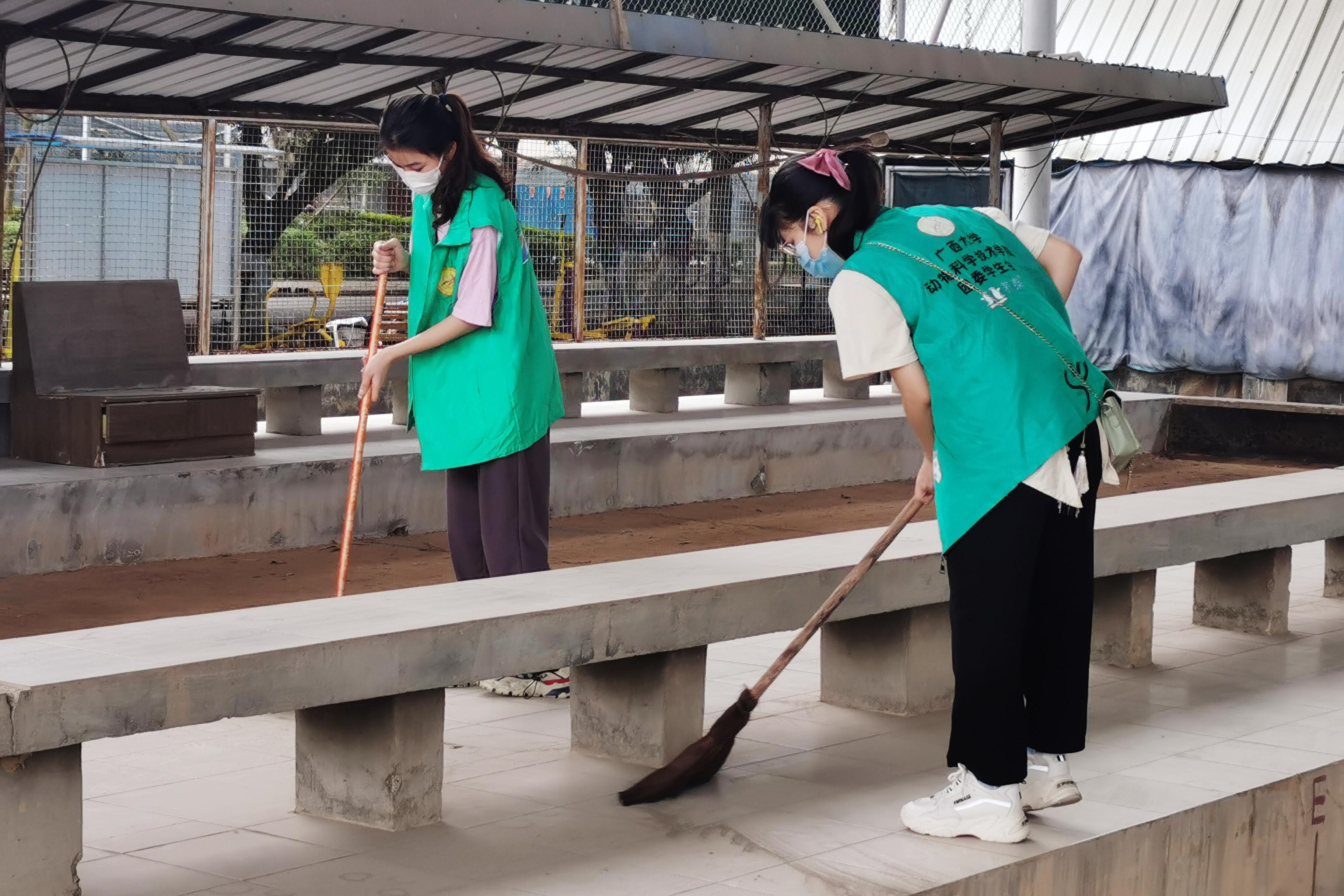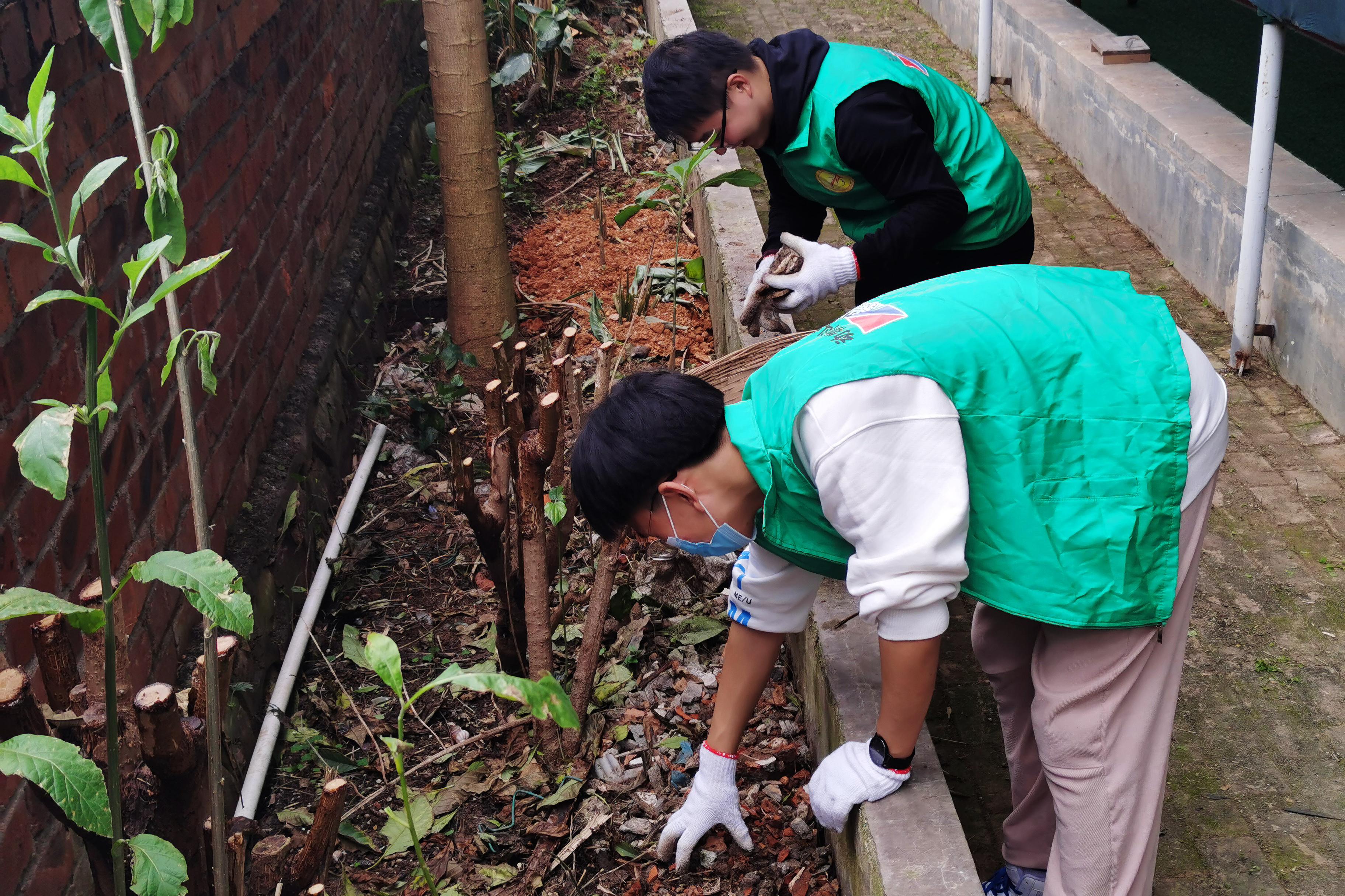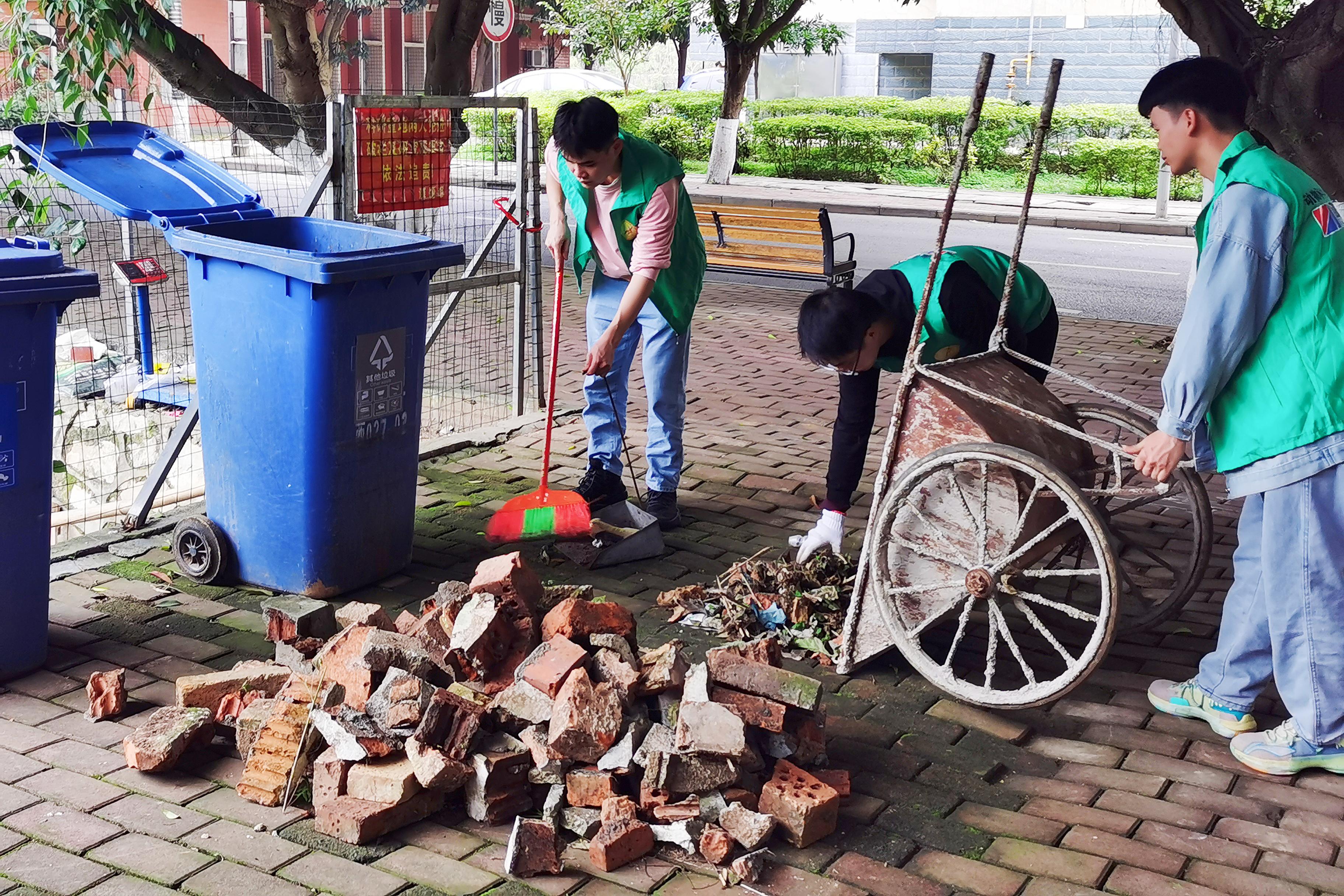志愿者们身穿绿马甲,拿着抹布、扫帚、拖把、锄头、铲子等工具,分工协作,相互配合,对活动中心内的垃圾、杂草、树枝等进行清理。经过两个小时的辛勤劳动,活动中心焕然一新。