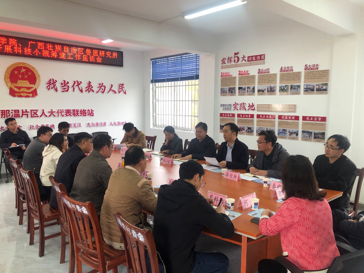 专家团队首先是参观了德保黑猪文化馆,了解广西地方特色品种德保黑猪的养殖现状和“铁桶计划”疫病防控模式的推广效果。接着与德保县县领导、县农业农村局、县教育局(科技局)、县科协、那造村村委、福喜乐养殖公司和广西扬翔股份有限公司进行座谈,韦小强书记和陆阳清院长从招生就业、研究生培养、科研合作和党建等方面介绍了学院的基本概况和发展现状,自治区党委办公厅派驻那造村第一书记蒋士圳介绍了那造村产业发展经验和人才需求,随后双方就地方种质资源保护利用、科技小院筹建等进行了详细细致交流。