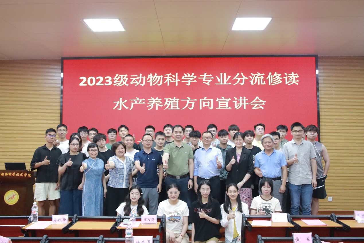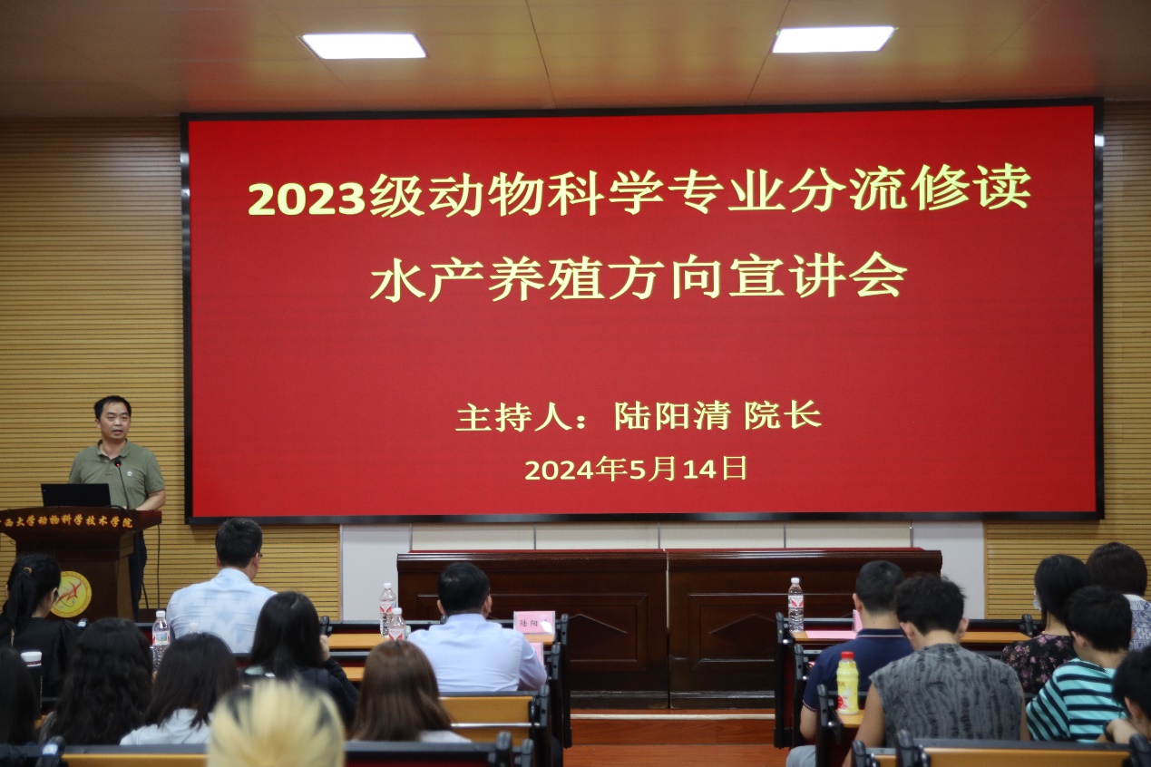 为做好水产养殖方向开设工作,5月14日下午,世界杯竞猜足球网在学院318报告厅举办动物科学专业分流修读水产养殖方向宣讲会,特别邀请广西水产科学研究院副研究员陆专灵博士、南宁海大公司水产线黄东总经理2位校友为同学们讲解水产行业的发展概况、前景和优势等多方面内容。世界杯竞猜足球app院长陆阳清,副院长蒋钦扬,水产方向潘英教授、李文红教授、麻艳群副教授、覃志彪老师、梁静真老师、欧伟豪老师,以及全体2023级动物科学专业本科生、水产全体研究生参加活动。会议由陆阳清院长主持。
