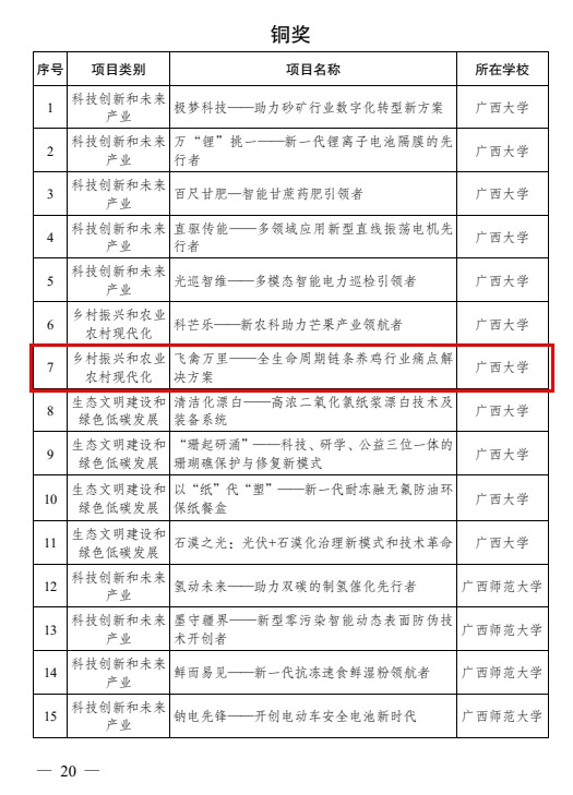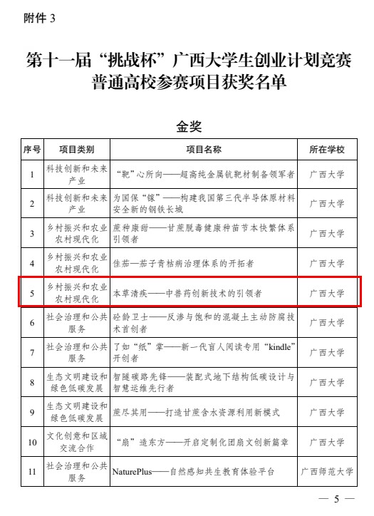 6月23日,由共青团广西区委、自治区教育厅、自治区科协、广西学联主办,桂林理工大学承办的第十一届“挑战杯”广西大学生创业计划竞赛获奖名单公布,我院何家康教授指导的“本草清疾——中兽药创新技术的引领者”项目和陆阳清教授指导的“飞禽万里——全周期链条养鸡行业痛点解决方案”项目在众多参赛项目中脱颖而出,分别斩获区赛金奖和铜奖。