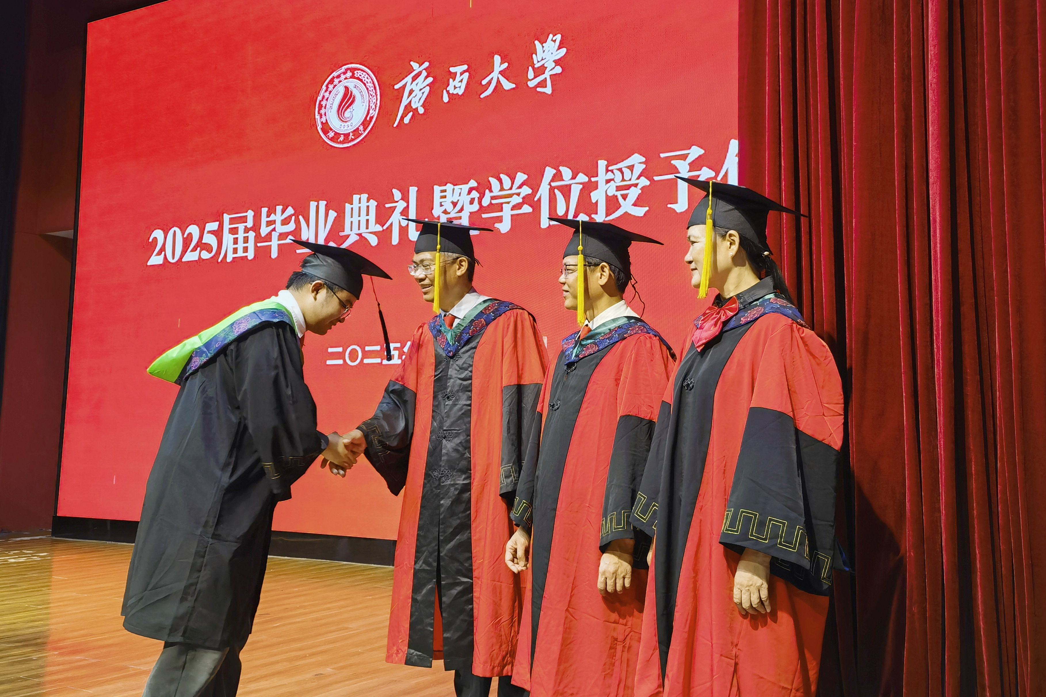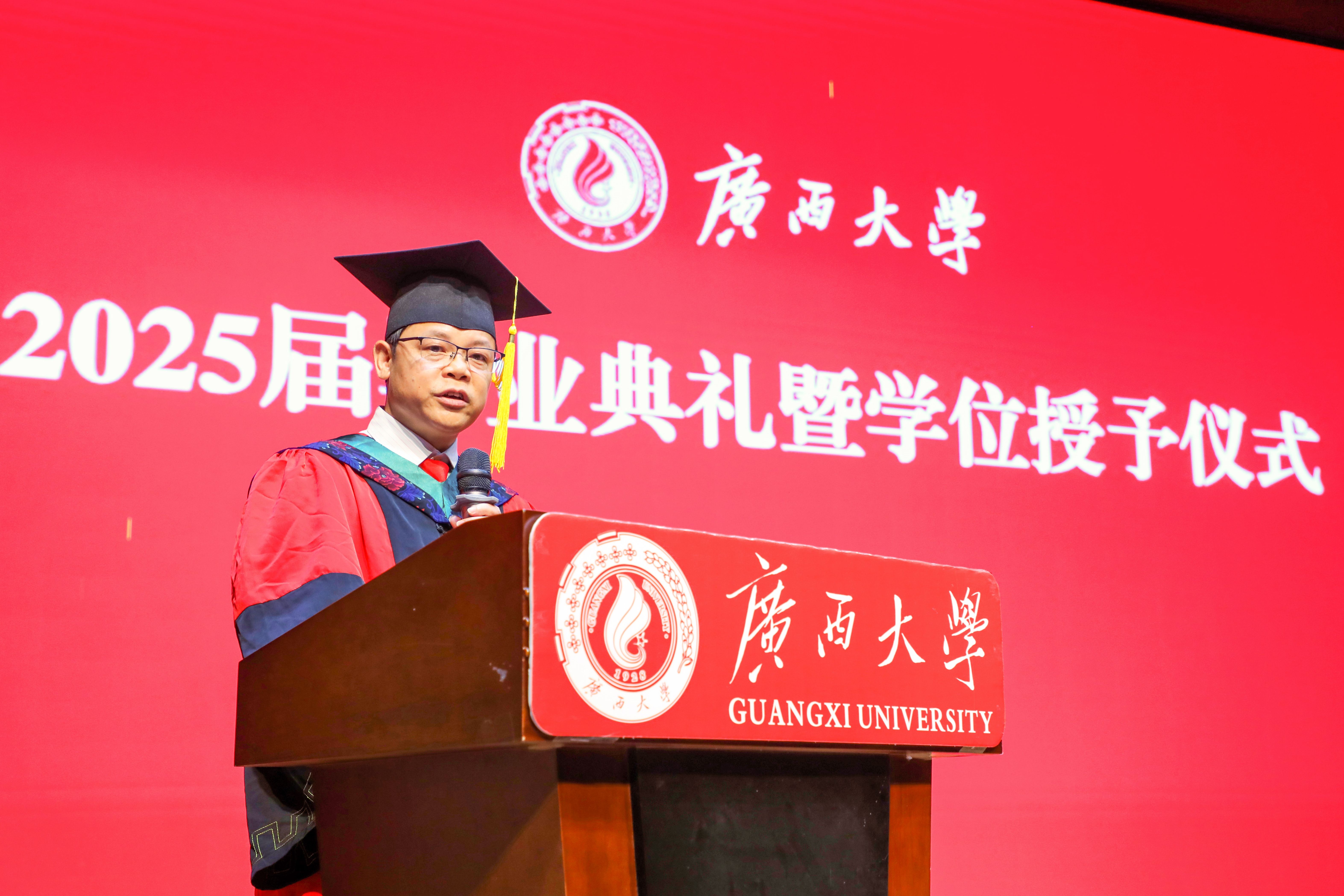 在雄壮的国歌声中,2025届毕业典礼暨学位授予仪式拉开帷幕。何家康老师宣读《广西大学2025年本科优秀毕业论文、研究生优秀学位论文名单》,韦祖樟老师宣读《关于授予张钰欣等429名毕业生学位的决定》。