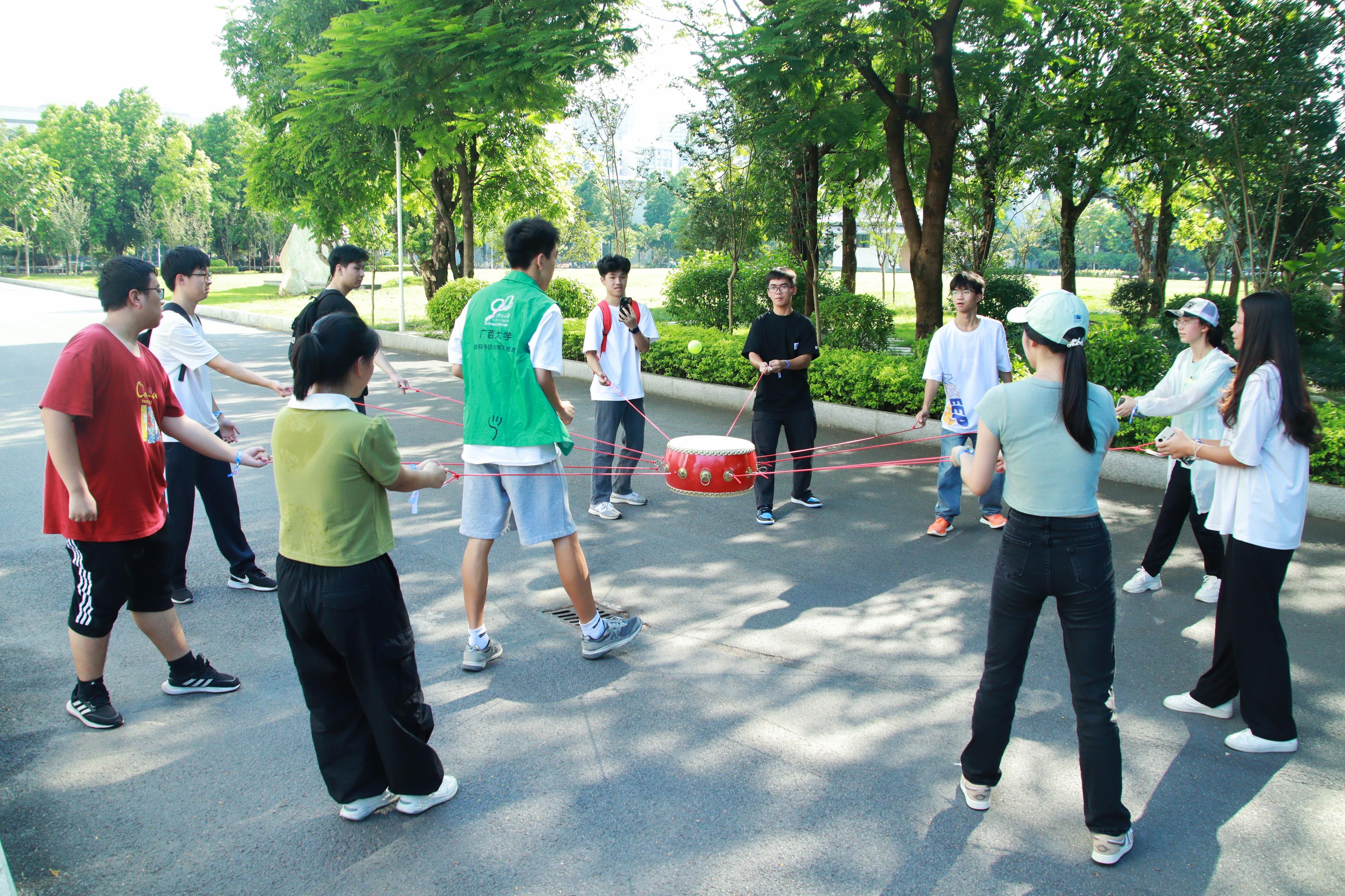 本次活动以游戏为载体,以运动为依托,分别在育才广场、大礼堂、汇学堂、图书馆、大学生活动中心、学生军纪念碑等校园标志性区域设置了6个游戏站点。世界杯竞猜足球app2023级本科生全员参与,随机分为20组,通过不同路径前往游戏站点,进行了“你的名字”、背篓接绣球、击鼓颠球、无敌风火轮、袋鼠跳、接力长绳等寓教于乐的团队训练项目,使得大家既在轻松有趣的氛围里,以游戏的形式增进了彼此间了解和信任,又在充满挑战的环境中,以团队的方式感受到集体的力量和智慧。
