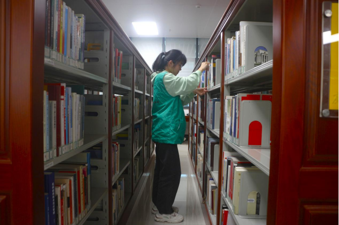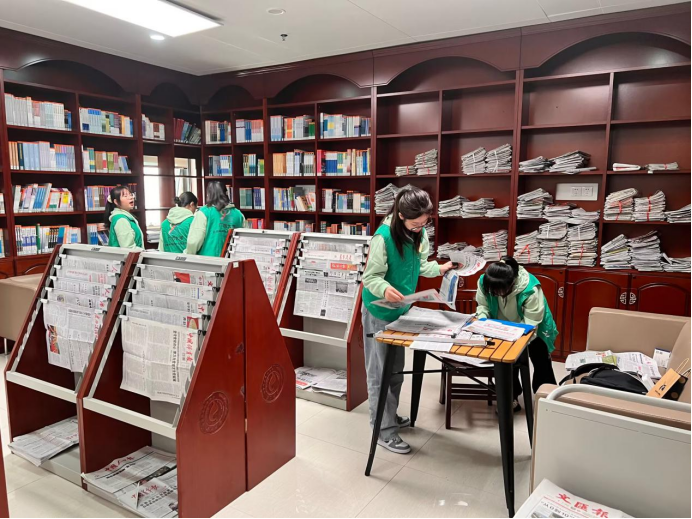 动科222班团支部的同学一大早就来到图书馆北区5楼协助整理书籍和报刊。大家按照图书馆工作人员的培训,先把书籍根据大类进行分门别类整理,再根据具体编号一本本归置到书架上,报刊也按照名称和发行时间进行排序整理。数百本书籍、报刊回到了自己的位置。