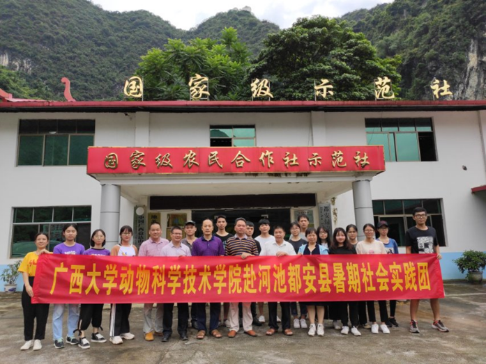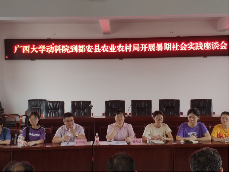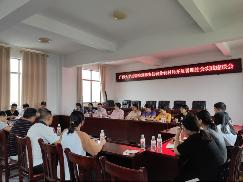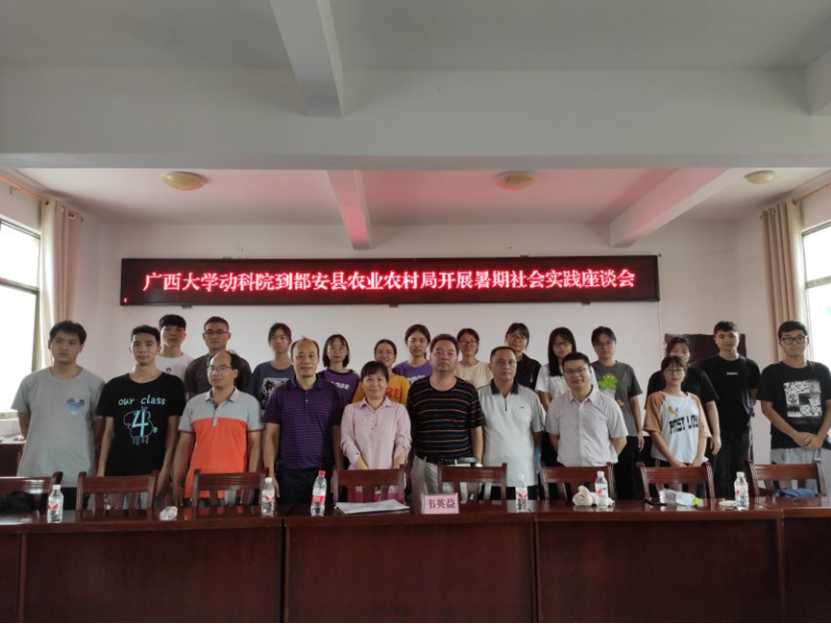2019年7月19-20日,由韦英益同志指导带领的世界杯竞猜足球网赴河池市都安县暑期社会实践团成员共18位动医2017级同学到都安县开展暑期社会实践活动。19日社会实践团全体成员与都安县水产畜牧兽医局的领导和技术员开展了关于“都安县畜牧业养殖现状及贷牛(羊)还牛(羊)特色扶贫模式”为主题的座谈会,韦海峰副局长、县防控中心陆高天主任和王兰芳副主任、县动监所韦生力副所长、牛羊产业中心石清柏主任以及兽医站站长、广西黑猪养殖学会罗明达会长等参加本次座谈会。