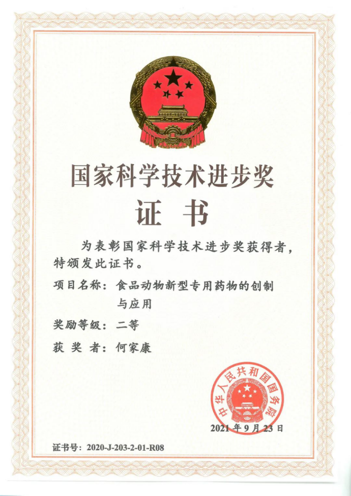2021年11月3日,国家科学技术奖励大会在人民大会堂举行。支部党员何家康教授参与的《食品动物新型专用药物的创制与应用》项目,荣获2020年度国家科学技术进步奖二等奖。