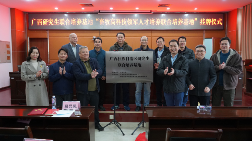 本次活动还举行了广西研究生联合培养基地“畜牧高科技领军人才培养研究生联合培养基地”挂牌仪式。该联合培养基地由广西大学牵头,广西壮族自治区畜牧研究所和中国农业科学院深圳基因组研究所作为合作单位,三方共同合作建设,针对广西现有的经济特点和区位优势,做好对研究生的培养工作,为广西的畜牧业发展建设培养高科技领军人才,引领畜牧业发展。挂牌仪式后双方专家就广西畜牧业发展和人才队伍建设进行了座谈交流。陆阳清教授首先就世界杯竞猜足球网的人才培养优势和项目资源做了相关介绍,广西畜牧研究所所长吴柱月研究员也介绍了广西畜牧研究所的基本情况。双方就利用好优势资源,充分发挥畜牧高科技领军人才培养研究生联合培养基地的作用,实现共赢发展,同时为自治区经济发展贡献力量,助力国家乡村振兴。