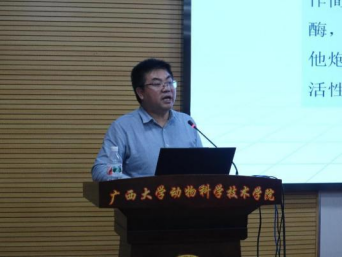 李建喜研究员在“发酵技术在中药创新中的应用研究进展”的报告中,详细地介绍了中兽药传统发酵技术与现代发酵技术、发酵菌种的开发与利用、发酵技术在中兽药创新中的作用、以及发酵中药在畜禽养殖中应用。列举鸡盲肠益生菌发酵黄芪多糖案例,发酵后可提高黄芪多糖含量,利用发酵黄芪多糖可有效提高肠道抗体水平,提高动物机体免疫力,并探讨了发酵黄芪调节树突状细胞活化,提高机体免疫力的作用机制;分析发酵菌可通过调控糖合成途径相关酶,增加多糖合成量,提高有效成分含量。在报告中提出在中兽药开发中应注重提质增效、降成本。利用发酵技术,筛选发酵菌种,评价发酵产物活性,分析发酵成分和结构,研究产物药理学作用机制,实现中兽药保质增效、降成本。并提出利用微生物,发酵药渣或药材废弃物,节约资源,实现资源再利用。最后,李建喜研究员介绍了中国农业科学院畜牧与兽药研究所的发展历程,所里研发团队与研究内容,欢迎同学们报考所里硕士生、博士生,或到所里工作,进一步促进所里与世界杯竞猜足球网的交流和合作,发挥发酵中药的优势,明确发酵中药的作用机制,促进中兽药事业的发展。