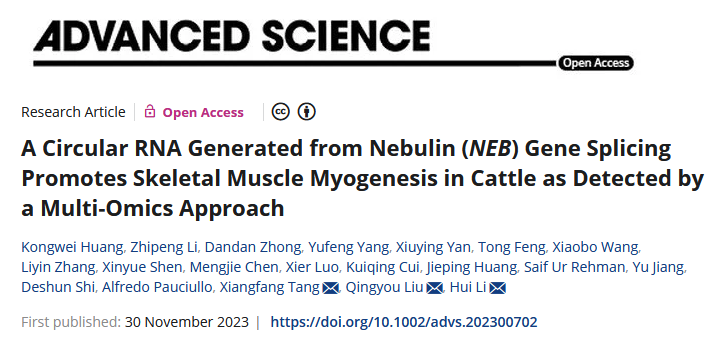 近日,世界杯竞猜足球网石德顺教授带领的动物克隆与生殖调控研究团队联合佛山科学技术学院、中国农业科学院和西北农林科技大学等单位在牛肉用性状功能基因组解析方面取得重要研究进展,研究成果以A circular RNA generated from Nebulin (NEB) gene splicing promotes skeletal muscle myogenesis in cattle as detected by a multi-omics approach为题发表于国际知名期刊《AdvancedScience》。广西大学为该论文的第一完成单位,博士毕业生黄孔威、助理教授李志鹏和博士研究生钟丹丹为共同第一作者,李辉副教授、佛山科学技术学院刘庆友教授和中国农业科学院唐湘方研究员为共同通讯作者。原文链接:https://onlinelibrary-wiley-com-s.vpn.gxu.edu.cn:8118/doi/10.1002/advs.202300702。