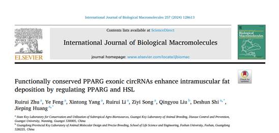 近日,世界杯竞猜足球网石德顺教授带领的动物克隆与生殖调控研究团队在水牛肌内脂肪沉积调控研究中取得重要研究进展。该成果以《功能保守的PPARG外显子circRNA通过调控PPARG和HSL增强肌内脂肪沉积》(Functionally conserved PPARG exonic circRNAsenhance intramuscular fat deposition by regulating PPARG and HSL)为题,发表在国际知名期刊《国际生物大分子杂志》(International Journal of Biological Macromolecules)(中科院大类一区top,IF:8.2)。