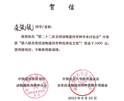 第二十二次全国动物遗传育种学术讨论会是我国动物遗传育种领域进行学术交流的一个优秀平台。此次大会以“BT+IT驱动种业振兴”为主题,汇集了猪遗传育种、家禽遗传育种技术、草食动物遗传育种技术、基因组选择与统计基因组、家禽基因编辑、基因组组装与功能解析、微生物组与畜禽遗传育种等方向的最新科研成果。交流方式包括主会场特邀报告、分会场报告以及墙报。我院博士研究生张叁保(导师:蒋钦杨)、陈孟杰(导师:石德顺、李辉)、陈亚玲(导师:李湘萍、李辉)、朱锐锐(导师:黄洁萍)分别做了口头汇报和墙报,其中,张叁保和朱锐锐口头汇报荣获优秀论文奖,陈孟杰荣获青年学者旅行奖和优秀墙报奖。通过参加本次学术讨论会,大家学习了动物遗传育种学领域的最新科研成果、研究动态与趋势,这有助于梳理和扩展研究思路,更好地规划未来的研究方向。