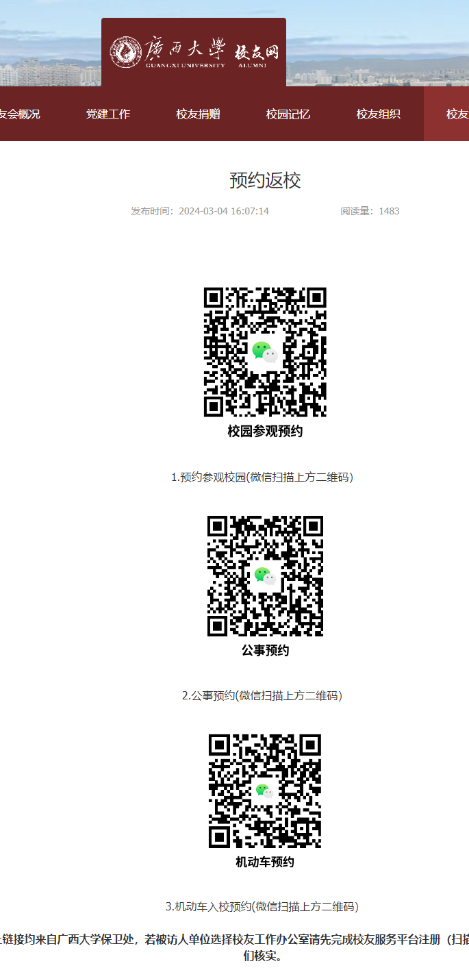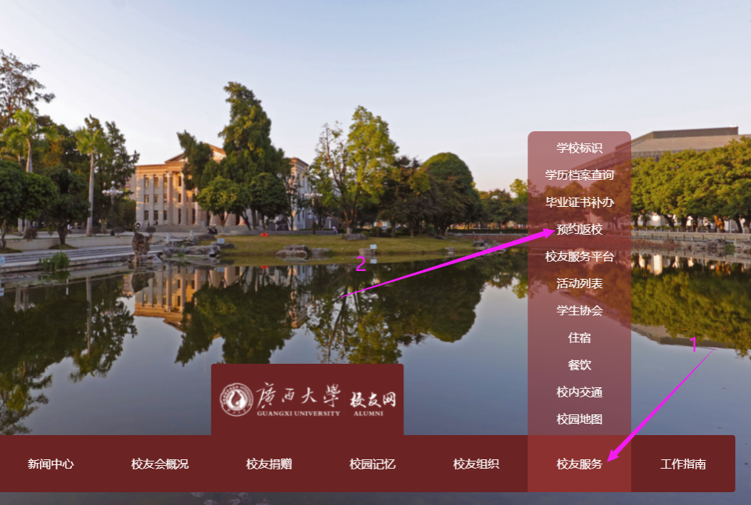 直接通过广西大学主页里的“校友工作办公室”广西大学主页--->机构设置----->(右下角位置)校友工作办公室点击后进入链接:广西大学校友总会https://alumni.gxu.edu.cn/#/,然后找“校友服务”项,进入“预约返校”链接后,按照里面的步骤操作就可以了。